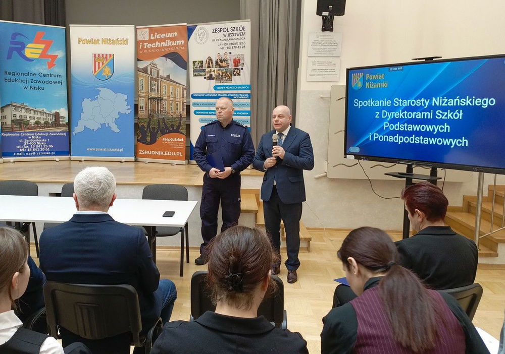 W Liceum Ogólnokształcącym im. hetmana Stefana Czarnieckiego w Nisku odbyło się spotkanie z dyrektorami szkół podstawowych i ponadpodstawowych z terenu powiatu niżańskiego. Inicjatorem wydarzenia byli Komendant Powiatowy Policji w Nisku młodszy inspektor Rajmund Murek oraz Starosta Niżański Robert Bednarz.
