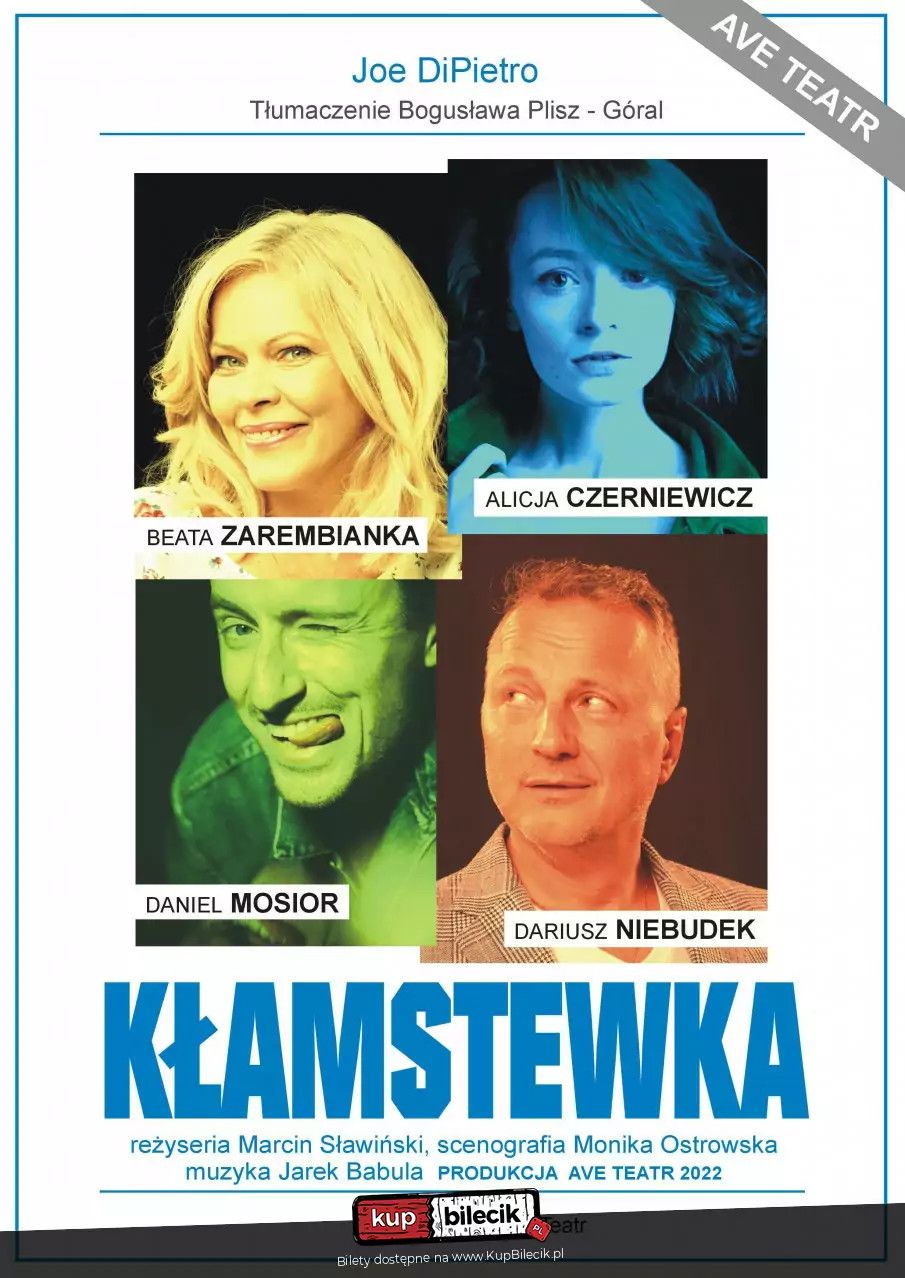 bilety: Skłonność do mijania się z prawdą wynika w dużej mierze z ludzkiej słabości do niewinnych KŁAMSTEWEK. A co jeśli są one tylko z pozoru niewinne? Czy kłamstwo w dobrej wierze, to na pewno bezpieczna gra? Autor sztuki Joe DiPietro przedstawia historię młodego małżeństwa, które przeżywa swój pierwszy kryzys. Jakich sztuczek użyją doświadczeni rodzice, aby uratować ich związek? A co jeśli przy okazji, na jaw wyjdą inne KŁAMSTEWKA skrywane przez lata. Spektakl Joe DiPietro to pełna inteligentnego humoru komedia, z błyskotliwymi dialogami, niczym z filmów Woody Allena, w której my widzowie przeglądamy się jak w lustrze. Reżyserem spektaklu jest Marcin Sławiński, tłumaczenie Bogusława Plisz - Góral, scenografię zaprojektowała Monika Ostrowska, a muzykę stworzył Jarek Babula. W spektaklu występują: Alicja Czerniewicz, Beata Zarembianka, Daniel Mosior oraz Dariusz Niebudek. Bilety do nabycia na: KupBilecik.plKłamstewka - Ave Teatr artyści: Alicja Czerniewicz, Beata Zarembianka, Daniel Mosior oraz Dariusz NiebudekSkłonność do mijania się z prawdą wynika w dużej mierze z ludzkiej słabości do niewinnych KŁAMSTEWEK. A co jeśli są one tylko z pozoru niewinne? Czy kłamstwo w dobrej wierze, to na pewno bezpieczna gra? Autor sztuki Joe DiPietro przedstawia historię młodego małżeństwa, które przeżywa swój pierwszy kryzys. Jakich sztuczek użyją doświadczeni rodzice, aby uratować ich związek? A co jeśli przy okazji, na jaw wyjdą inne KŁAMSTEWKA skrywane przez lata. Spektakl Joe DiPietro to pełna inteligentnego humoru komedia, z błyskotliwymi dialogami, niczym z filmów Woody Allena, w której my widzowie przeglądamy się jak w lustrze. Bilety do nabycia na: KupBilecik.pl |